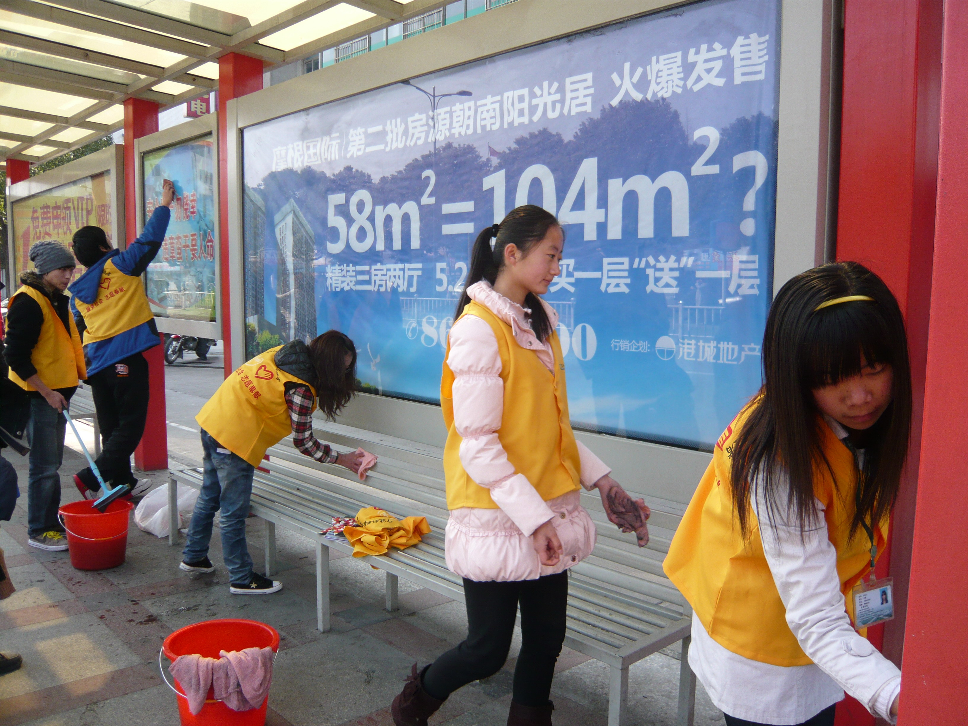 图为:工商管理系志愿者擦拭公交站牌