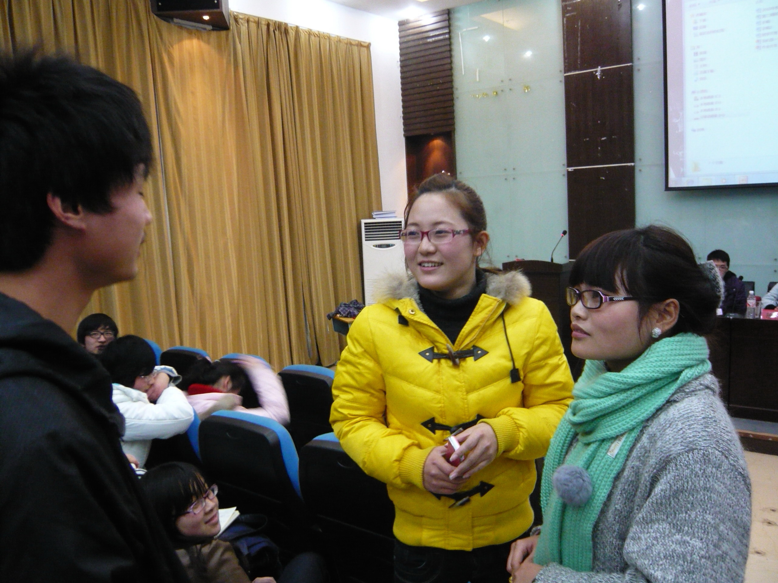 图为:出席本次活动的有工商管理系团委书记陈茜茜、团委副书记王波、团学培训班成员