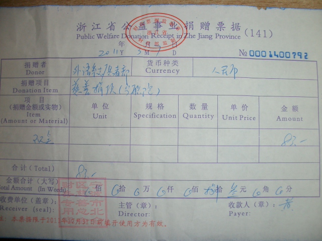 图为:外语系志愿者部慈善捐款票据