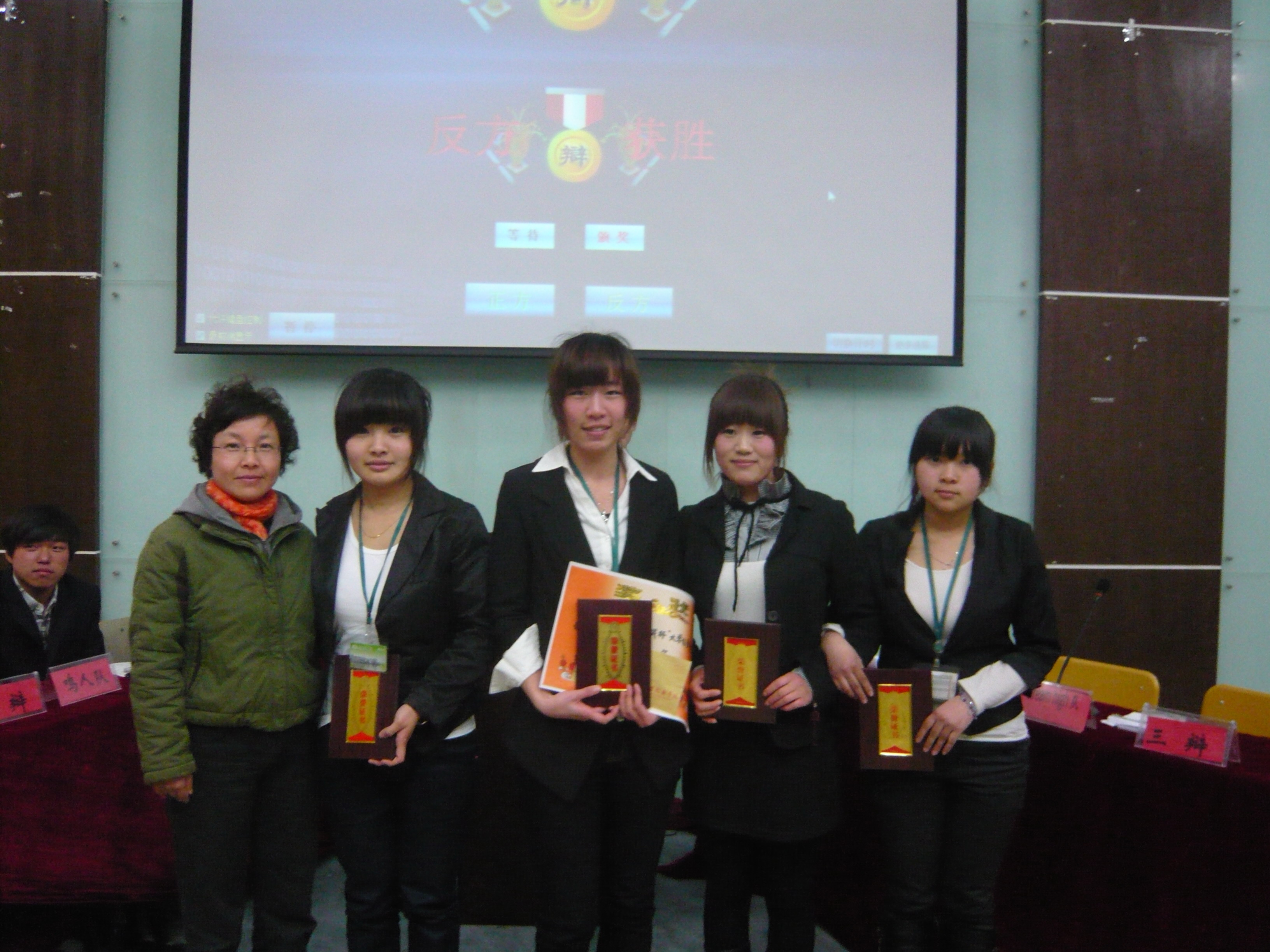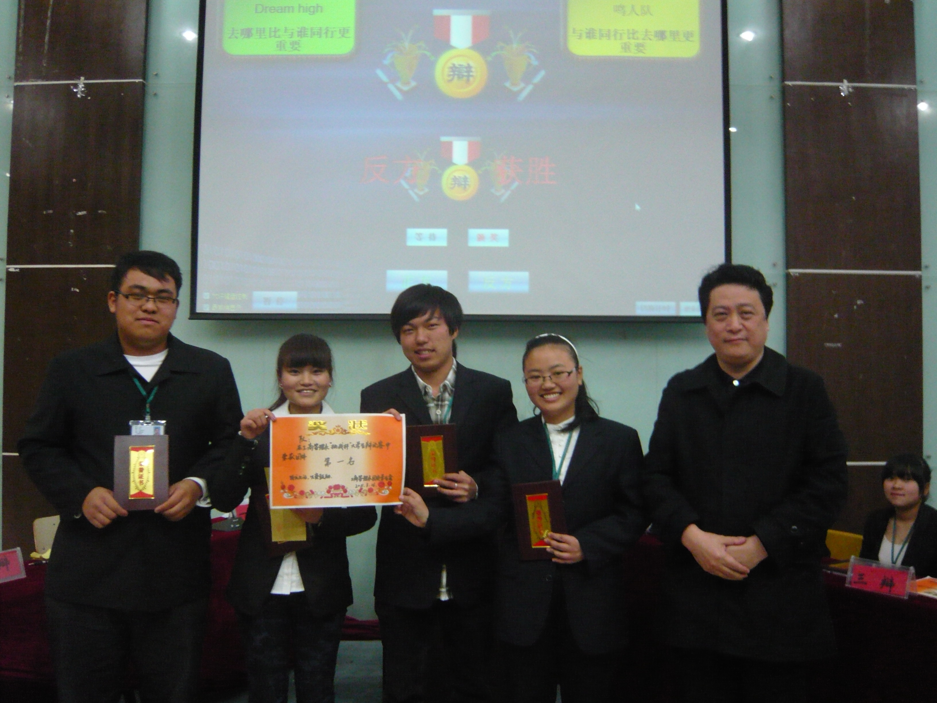 经过一段时间的分数统计,最终鸣人队凭借着出色的反应能力和严谨的逻辑夺得了本届“挑战杯”冠军,Dream High队惜居亚军。此外,反方三辩李玉君同学获系“最佳辩手奖”。正方二辩李哲娇同学获系“最佳风采奖”。同时在此次辩论赛上由团委书记陈茜茜老师以及人文社科部吴艳冬老师分别颁发了本届“挑战杯” 第三名竞技队和第四名秀才秀彩队。