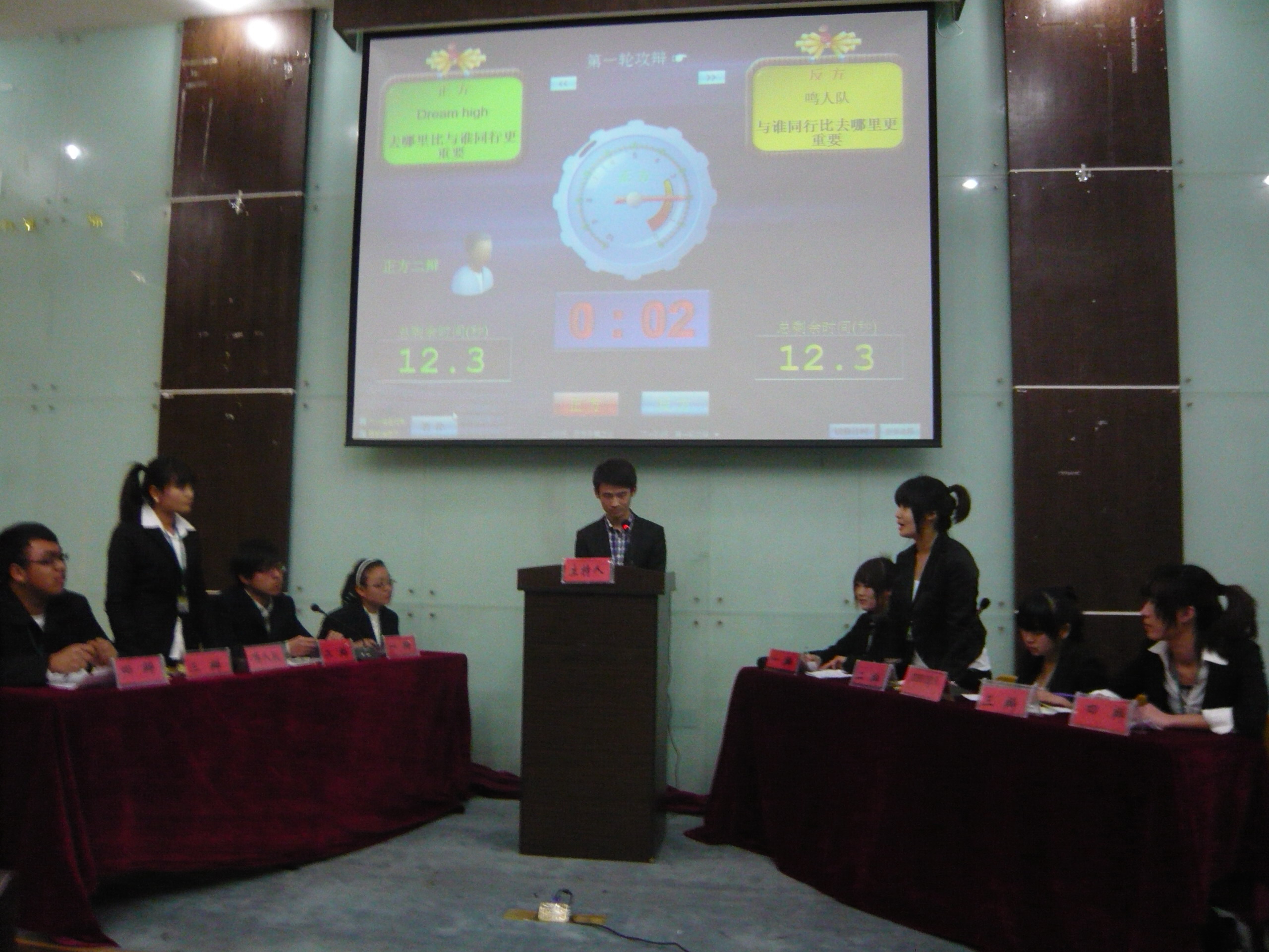 整场比赛持续了近一个小时。比赛开始前,双方辩手们早已摩拳擦掌,胸有成竹,而且两队后援团更是强劲,一时之间场上场下已弥漫着一股浓浓的紧张兴奋的味道。
