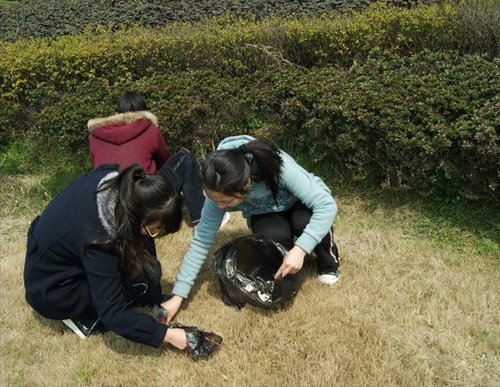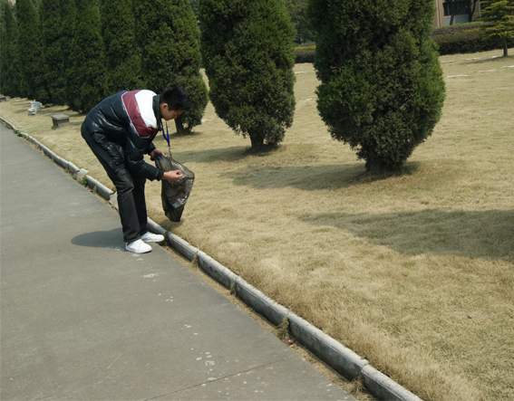 在这个阳光明媚的日子里,待到所有的志愿者到齐之后,“大扫除”开始了。学生会主席孙凯做表率,他卷起袖子,手拿塑料袋,四处寻找垃圾,只要一发现,就立刻把它放进垃圾袋中,再汇总放到附近的垃圾箱中。在他的带领下,其他的志愿者们也不甘落后,开始了地毯式的大清扫。