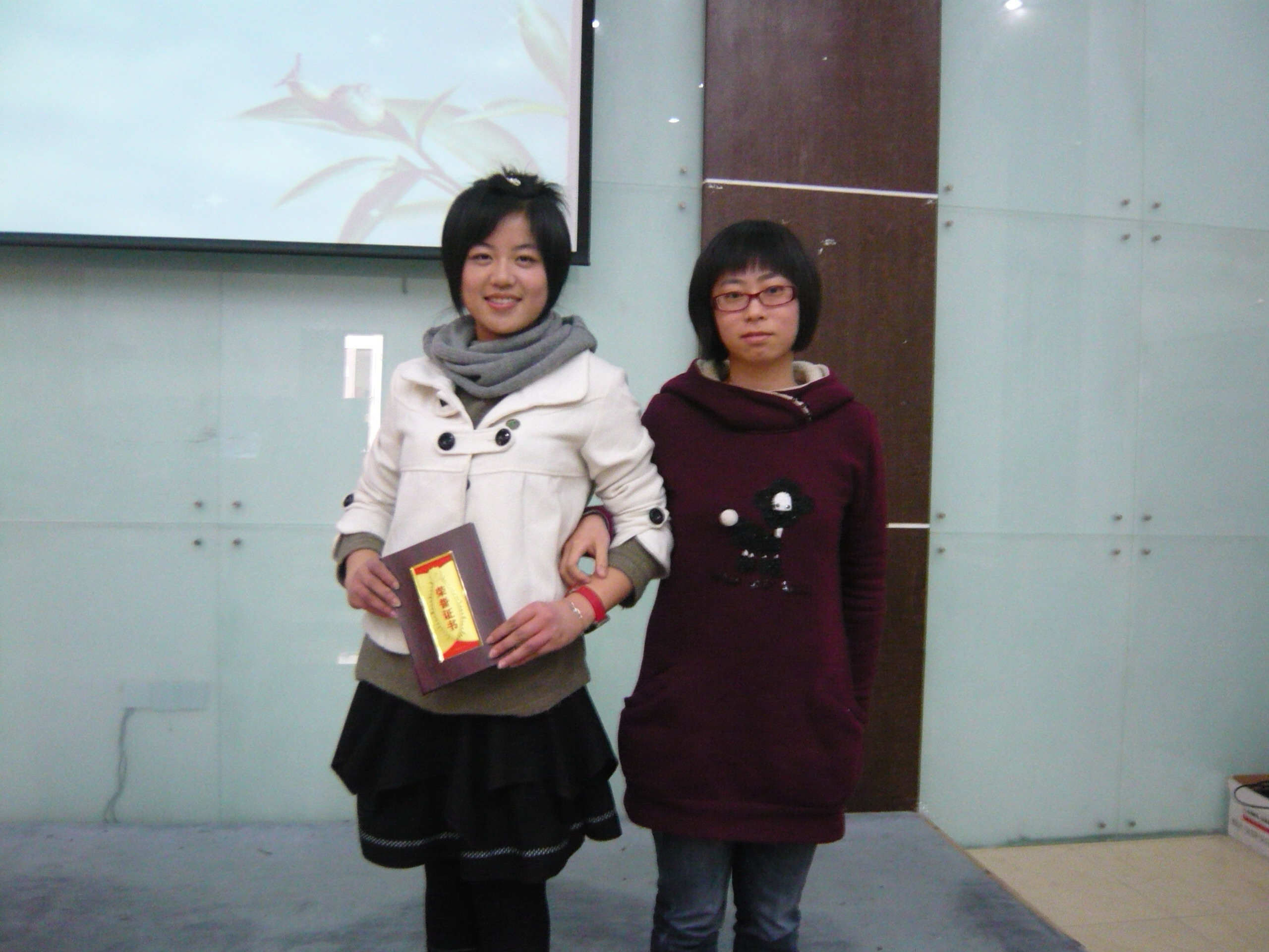 图为:李婷?老师与获二等奖的杜淑芳同学合影