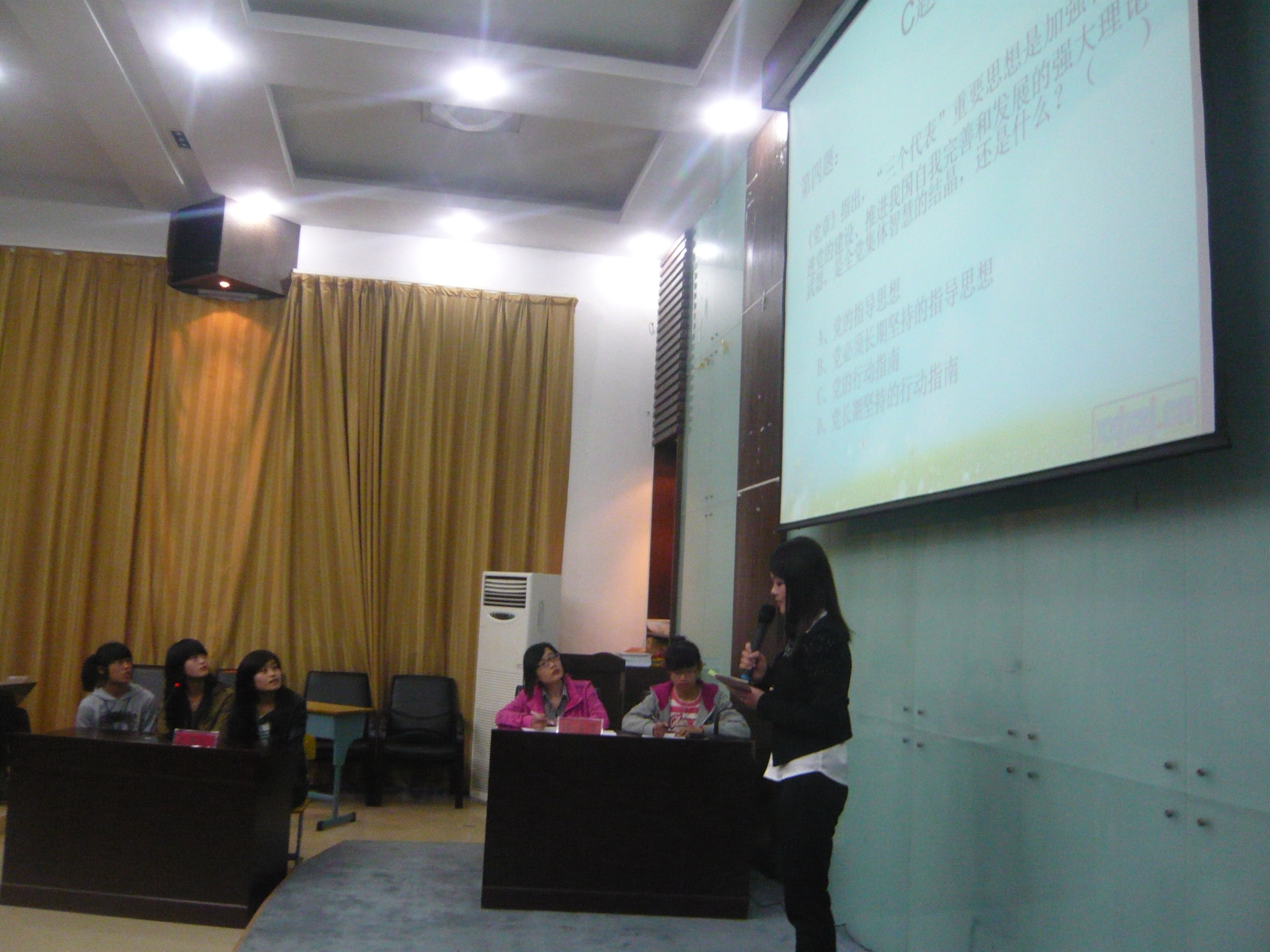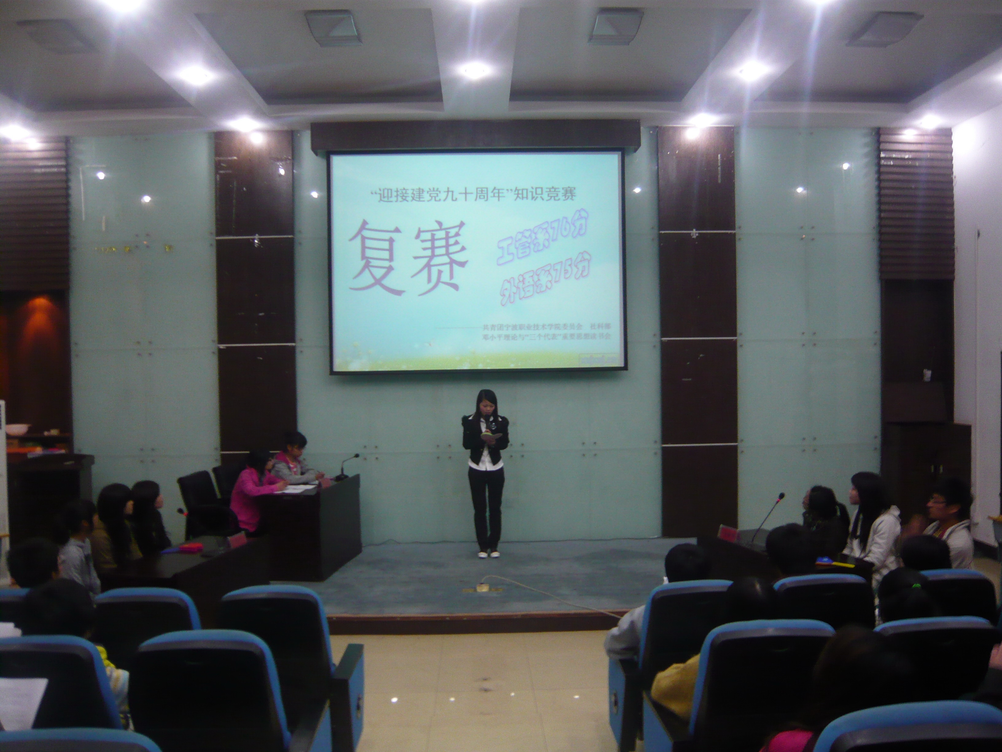为了铭记党的伟大历史,引导帮助我院学生深入学习马列主义、毛泽东思想、邓小平理论、“三个代表”重要思想和科学发展观,进一步掌握党的基本理论和知识,宁职院特开展“迎接建党九十周年”知识竞赛。4月1日晚在1号楼105教室举行了工商管理系和外语系之复赛“两两答辩”,共有100余名同学观看此次比赛。