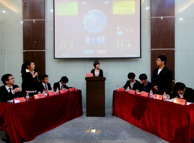 经过四周初赛、复赛、半决赛的激烈角逐,电子信息工程系、机电工程系进入辩论赛决赛的舞台。此次决赛辩题是结合当今社会,和近期国内外发生的大事件命题―― “在人类社会发展中,人文比科学更重要,还是科学比人文更重要”。开场,正反方辩手进行简要自我介绍后,比赛进入唇枪舌战。作为正反的电子信息工程系以“科学主导人类社会发展方向,是推动社会发展的进程,是社会发展的第一生产力”为开场陈词,坚持“在人类社会发展中,科学比人文更重要”。而反方机电工程系引用《辞海》中的名句“人文指人类社会的各种文化现象”来阐述人文的本质内函是重视人的文化,并提出人文的核心是“人”,一人文本,关心人、爱护人、尊重他人,从而坚持“在人类社会发展中,人文比科学更重要”的观点。