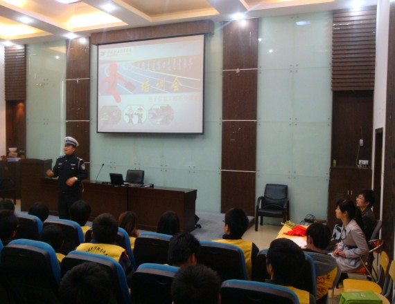 首先,许队长向在场的志愿者们介绍了北仑区目前交通的状况、存在的问题以及文明交通志愿服务活动的基本要求等内容,并现场演示了几个在指挥交通路口的基本动作让大家学习。接着许队长通过一系列生动、形象的真实视频案例,向志愿者们讲解交通秩序维护应该注意的要点、如何正确指停车、直行、转弯等手势和如何向市民们讲解并劝导其出行文明的方式方法,并指点了志愿者在路口的站位方式和位置。为了让志愿者们能更好的做好指挥工作,特别现场邀请几名同学做了错误的示范,与许队长的正确示范做对比,更好的让志愿者们理解。有些同学还不是很明白一些细节问题,就举手向许队长进行提问,许队长面对大家的提问感到很高兴,说明大家有认真在听、在思考,最后耐心的一一做出了解答。
