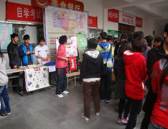 中午11点整,学生会的干事们早早的开始布置现场,为半个小时后的海报展做准备。20分钟后,随着下课铃声地响起,同学们纷纷来到食堂用餐。当同学们来到食堂门前的时候,立刻被海报展所吸引。同学们都聚拢过来,很快一些有特色的海报前就排起了长长的队伍。同学们在海报前交谈着,评论着。他们对着海报发表自己的见解,最后投出他们神圣的一票。