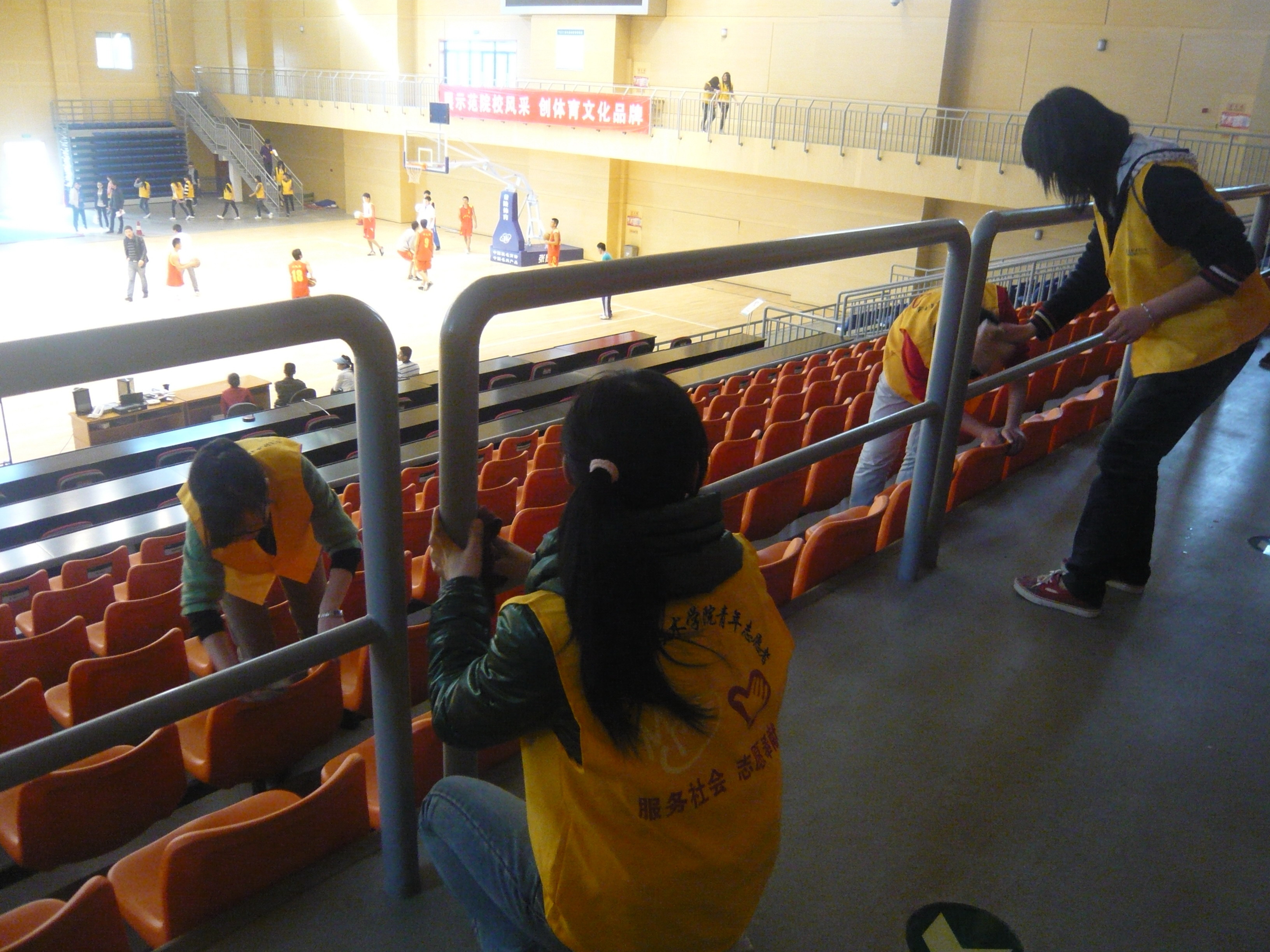 此次活动内容丰富多彩:志愿者们从擦洗椅子开始,将观众席的桌子、扶手、玻璃等都一一打扫干净,整个过程,我们基本都没能看见他们的脸-----因为他们都在躬身与桌椅奋战。他们一丝不苟的工作态度大大提高了工作效率,提前半个多小时就已将篮球馆打扫完毕。但是,他们并没有提早离开,在看见球场清洁好了之后,他们直接来到体育馆大厅,将大厅内的玻璃门,橱窗都认真得擦拭了一遍,当发现还有时间时,又返回篮球场中自己刚劳动过的地方,一看见还有污渍,立即返工,务求做到更好。