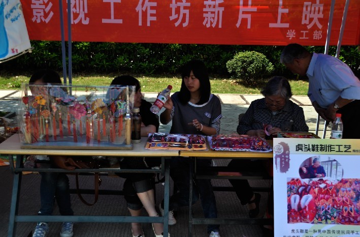 虎头鞋是一种中国传统民间手工艺制作的童鞋,因鞋头呈虎头模样,故称虎头鞋。它既有实用价值,也有观赏价值,同时它又是一种吉祥物,人们赋予它驱鬼辟邪的功能。在非物质文化遗产区,我们看到了乐氏传人――乐翠娣老人。她除了那远近驰名的剪纸手艺,做虎头鞋也是她的一大绝活。我们也对乐翠娣老人进行了采访,她说:“现代社会发展了,非物质文化遗产也可能面临消亡。我希望能通过制作虎头鞋来继承非物质文化遗产。其实,虎头鞋做工复杂,仅虎头上就需用刺绣、拨花、打籽等多种针法。鞋面的颜色以红、黄为主,虎嘴、眉毛、鼻、眼等处常采用粗线条勾勒,一定要能夸张地表现虎的威猛。”据悉,乐翠娣老人曾将虎头鞋带进世博园,发扬了中国的民间艺术。同时,她的手工虎头鞋还获得2008年浙江省“千镇万村种文化”展演展示活动才艺演示奖。