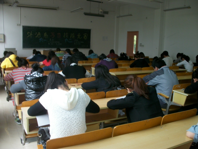 大一学生与大二学生分别以“生日” 、“运动”为比赛题目。字数分别为300字和600字。在老师仔细说明了比赛规则后,同学们便开始了紧张的比赛。日语、韩语、西班牙语、英语专业的学生发挥各专业的特色,仔细思考后列出提纲有条不紊地写起来,完全沉浸在外语的魅力中。虽然大一学生初次参加这种专业性的技能竞赛,但丝毫没有表现出怯场,而大二学生经验十足,但仍谨慎地进行着自己的写作。