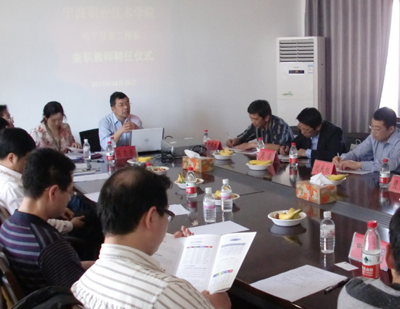 下午1:30分仪式开始,首先由电子信息工程系党总支书记、系主任吴老师向企业外聘教师们介绍了电子信息工程的基本情况、教学学风以及电子信息工程系各大专业职能的基本要求。同时向应聘老师的企业教师们说明电子信息工程系应用电子专业和计算机技术应用专业为国家示范专业,计算机专业和电子专业是宁波重点服务专业,希望在企业老师的加入下,电子信息工程系的学生们能够掌握更专业的技术,毕业后成为企业的首选。