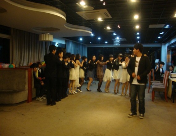 数秒钟后一支青春而又轻快地兔子舞,将全场跳热。轻快的舞步,甜美的笑声明使在座的同学们并不认为这是一个惩罚,而是一个表演。并且大家纷纷加入兔子舞的队伍中全场舞动。气氛一下子热到了极点。