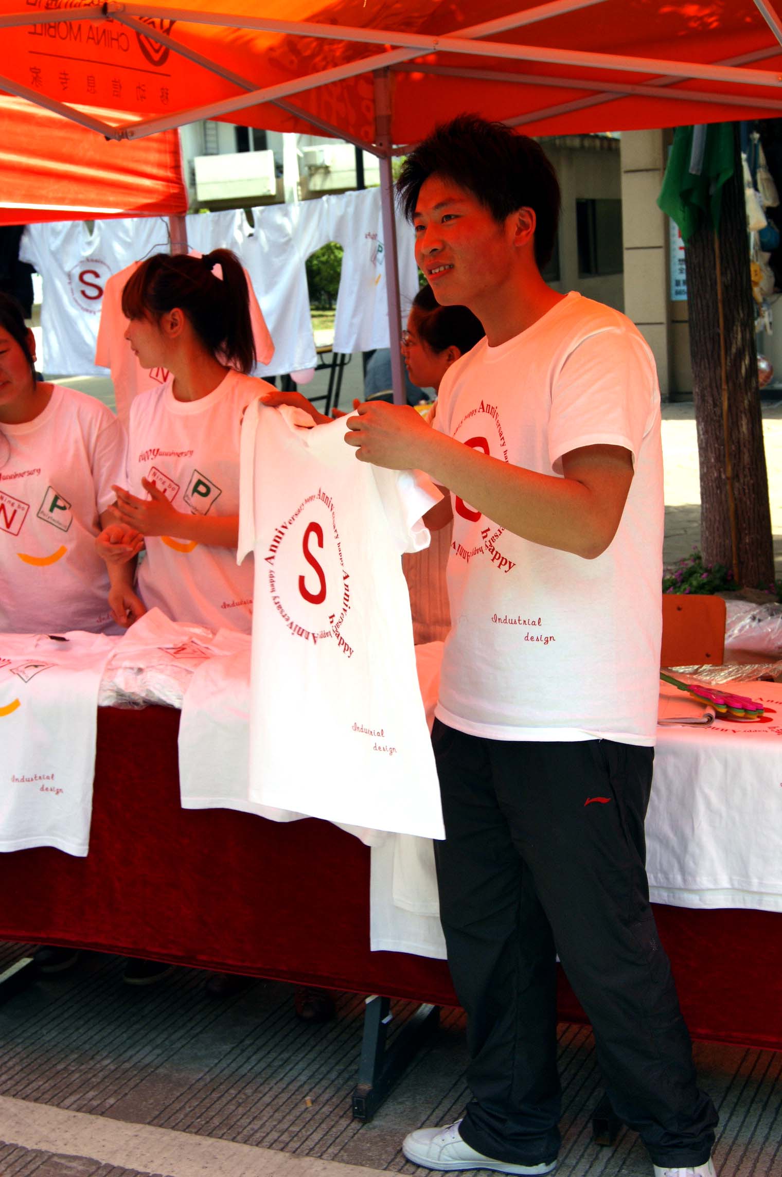 图为:志愿者叫卖手绘校庆纪念T恤