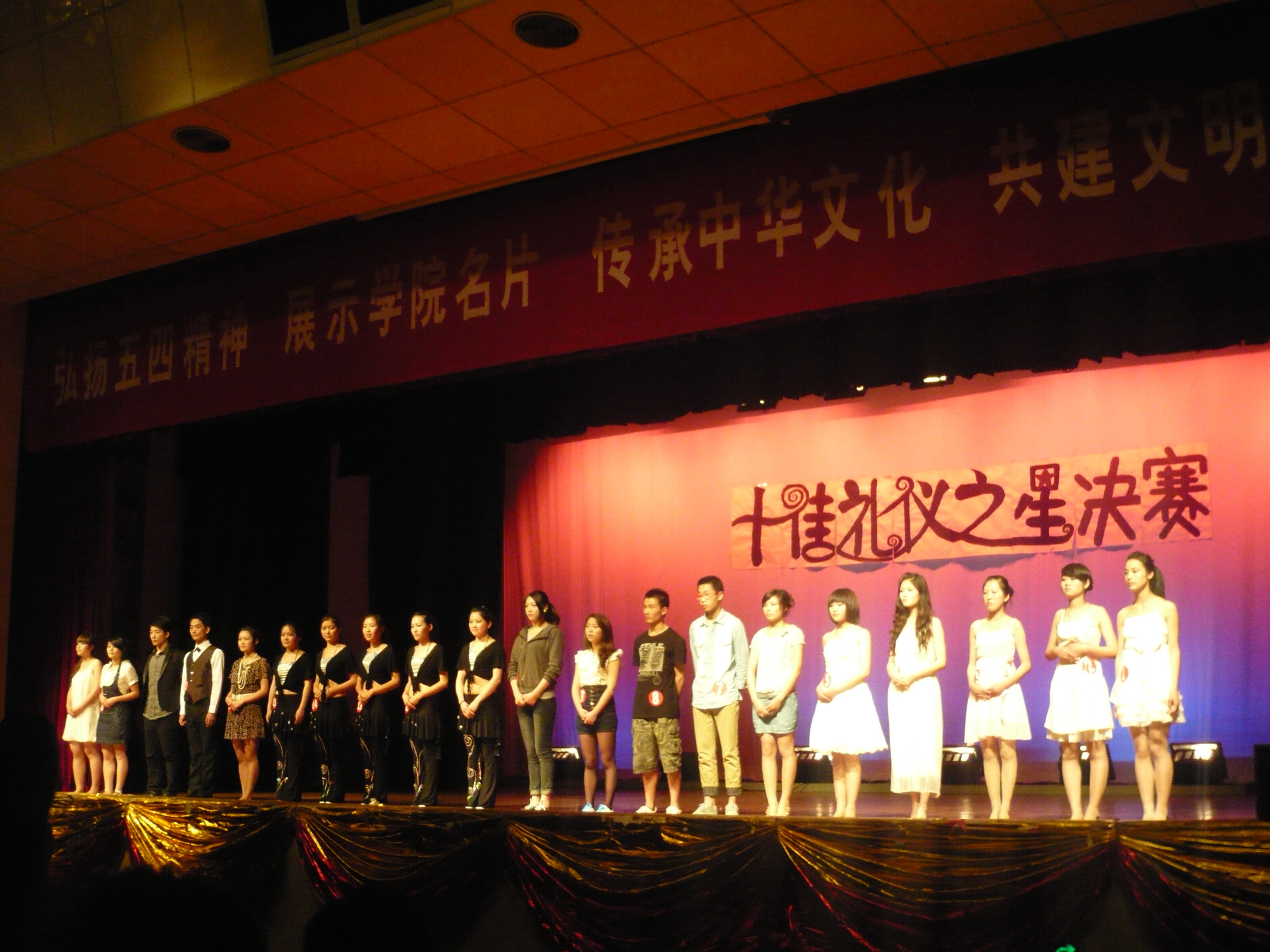 5月4日晚,院十佳礼仪之星总决赛在大剧院隆重举办。特邀学工部任婕老师、校礼仪队队长孙婷婷、院文娱部部长孙蒙、社团联艺术社科类主席彭梦晨出席并担任本次决赛评委。经过前期各系举办的系十佳预赛、决赛,共有20位选手脱颖而出进入本次院十佳礼仪之星总决赛。
