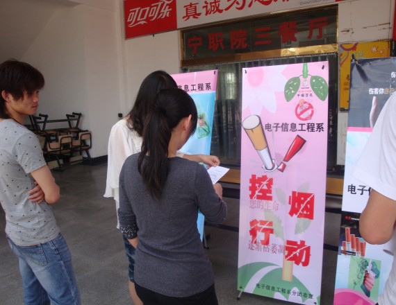 5月10日中午11点,电子信息工程系的各个副部及主席团候选人在食堂门口发传单、做介绍,进行控烟宣传。2011年5月31日是第24个世界无烟日,在无烟日来临之际,电子信息工程系学生组织宣传,向老师及学生进行丰富多彩的控烟宣传活动,为创建无烟环境贡献了一份微小的力量。
