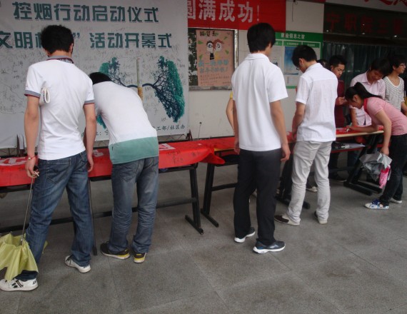图为:同学们正在横幅上面签上自己名字支持控烟活动