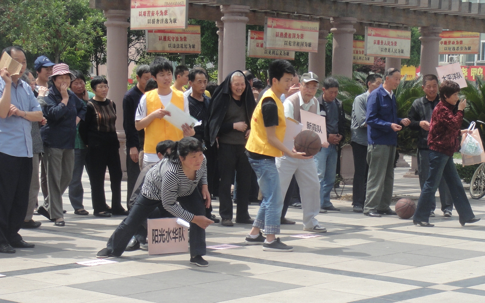 到达社区后,他们便联系社区负责人,然后由负责人向大家介绍此次凤凰社区举办的趣味运动会的注意的事项:此次活动中一共有五个比赛,分别为“保龄球”、运送乒乓球、俩个人夹着气球绕对面志愿者一圈回到原点、穿针引线、接力扑克,一共有分为五个队伍参加比赛。随着社区主任的宣布声,运动会开始了。首先是放“保龄球”,每对的10个成员依次用篮球击倒对面摆放的水瓶,一个志愿者摆瓶子一个志愿者记录分数,阿姨们也随之紧张起来,全神贯注的盯住前方的水瓶;接着是运送乒乓球,每个人依次运送一个乒乓球到对面,虽然不是那么顺利的运送到终点,但是在他们的努力下取得了成功;俩个人夹着气球绕对面志愿者一圈回到原点,这是在考验阿姨们的默契;紧接着就是社区阿姨最拿手的穿针引线,每个人将两枚针串到固定的线上;最后在接力扑克中结束了整场运动会。