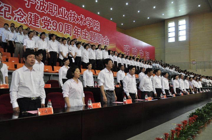 全体起立,奏唱《国歌》、校歌《向着太阳起航》。在嘹亮的歌声后,获得宁波市教育局举办的宁波市高校庆祝建党90周年“党旗颂”诗歌朗诵二等奖的四位朗诵者们带来的诗歌朗诵《党颂》让全体师生共同回顾了中国共产党成立90周年以来的我国翻天腹地的变化。同时,院党委书记、执行院长苏志刚带领全体党员教师和学生重温了入党誓词,并发表了讲话。期间,院领导为11个先进基层党组织、11位优秀党务工作者以及21位优秀共产党员进行了表彰并颁发了证书。