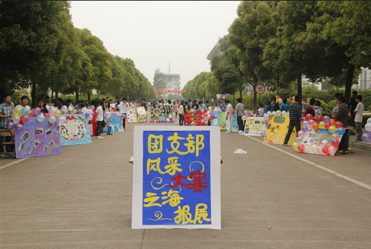 5月12日中午,各个团支部在我院创业街上进行了海报展,他们别具特色的设计,展现了各个团支部特有的风采,海报上不但有团支部参赛的口号,还描述了团支部在大学中的成长历程,也介绍了他们的梦想,彰显了团支部的精神。其中,国贸1031海报展上这样写到:“人生的旅途也许是坎坷的,但大学的生活是短暂而美好的,让我们用青春的脚步奏响生命的乐章,用拼搏的汗水谱写人生的辉煌,让我们一路坚持永不言败,小队成功与失败,笑到最后,笑得最美。”