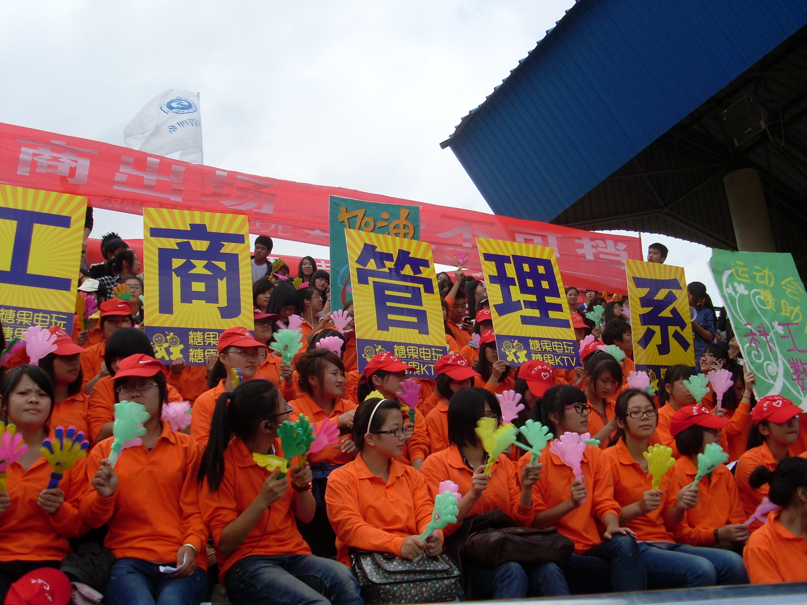 庞大的阵容、整齐的服装、闪亮的橙色、欢快的歌曲,外加震耳欲聋的呐喊声,这就是工商管理系啦啦队志愿者队伍。大鼓、手拍、吹气棒,是每一位啦啦队志愿者的必备武器。每当有赛事进行,拉拉队志愿者的加油呐喊声响彻整个赛场,成为看台上一道独特的风景线。“运动健儿,你是我的英雄。工商管理,你我一起加油。赛场精英,你是我的骄傲。工商管理,大家一起加油。万千群芳为我们呼吼yeah oh”啦啦队志愿者们为大家带来的工商管理系加油之歌,也是此次运动场上的一大亮点。歌声鼓声加油声,啦啦队志愿者们用他们的热情与激情感染着场上每一位运动员。