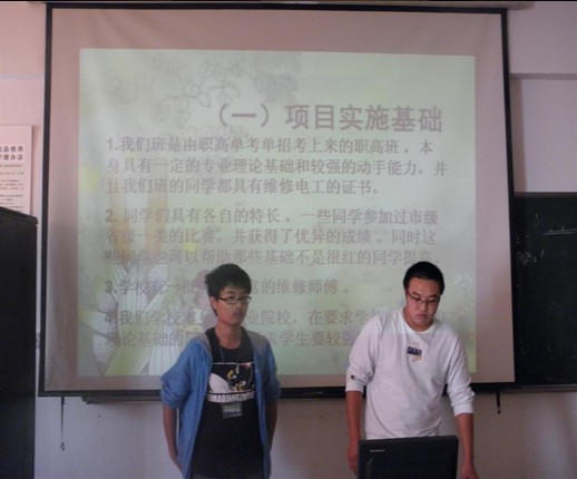 答辩会开始后,各班负责答辩的同学轮流上场,按照自己所学的专业特色进行班级的答辩。在她们当中,有的电子专业的班级创建学院电子屏幕维护特色班级,希望通过此项目来提升班级同学的动手实践能力;有的计算机专业班级创建学院电脑维修特色班级,希望通过自己学到的专业知识,来为学校里的师生提供完善的电脑服务。但是在这么多的特色班级中给人留下印象最深的就是电子3114,他们班的主题是绿化校园。在答辩前,他们事先拍摄了大量宁职院的照片,有绿树成荫的照片,有被人踩踏过,只留下泥泞的照片。那些草坪上光秃秃,绿化丛中随地可见的垃圾,这些照片极大的震撼了在座的每一位老师和同学的心灵。他们希望借创建特色班级这个机会,通过全班同学的努力,能够改善宁波职业技术学院校园的整体环境,宣传校园绿化环境的重要性,倡导大家树立环保意识。从中也看出了电子信息工程系的学生具有强烈的爱护校园的责任心与环保意识。