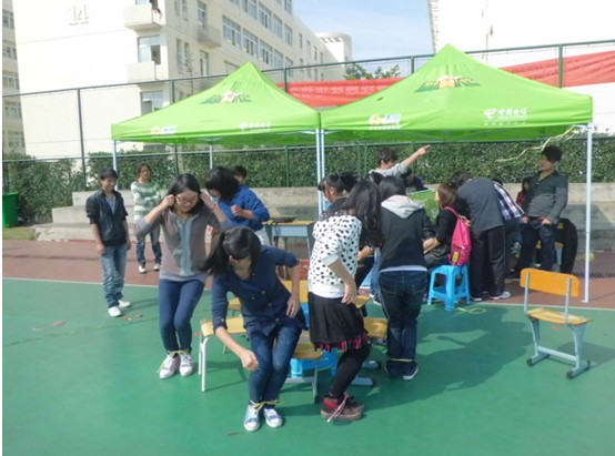 而秉承了去年热门项目竹间舞之舞动竹间,也是热闹非凡,极具动感的《兔子舞》伴奏加上“啪”“啪”的竹竿碰撞声,都为场地渲染了热闹的气氛。此外,尤其是智力大比拼项目,引入了融汇中国古人智慧的孔明锁、变形积木等道具,使热爱智力游戏的同学流连忘返。更有“七拼八套”、“极限挑战”、“足下比拼”、“智勇大冲关”、“单脚火车跑”、“无敌风火轮”、“打保龄球”、“过桩篮球”、“活力四射”、“仙人指路”、“步步惊心”等多项活动也使趣味运动会赛场上掀起了一阵阵的高潮。