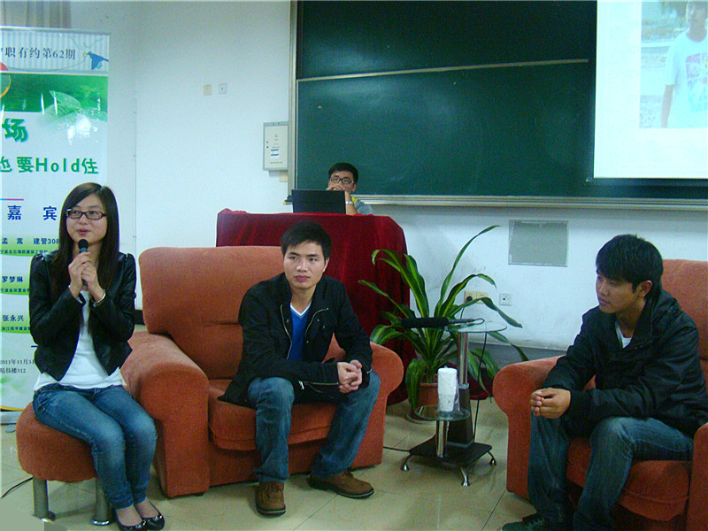 2011年11月3号晚6:00整,建筑工程系在精技楼312教室举办了第62期宁职院有约。应邀参加本次活动的有院学工部副部长徐莺老师、学工部刘光艳老师、建筑系党总支副书记丁立人老师、建筑系辅导员伊世香老师、陈茜茜老师,以及活动嘉宾有宁波金田置业有限公司前期管理罗梦琳、宁波北仑海防建筑工程部施工员孟嵩以及浙江新宇建设集团有限公司施工员张永兴三位宁职院的优秀毕业生。