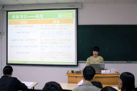 2011年11月2日中午,国际学院班集体特色项目化建设答辨会在外院举行。此次答辩会的形式颇具特色,为了更好的给学生们提供更专业的意见,特按专业特色不同分为设计类班级与外语类班级在302教室和402教室分别展开答辩。国际学院团委书记徐俊杰老师和团委游华丽老师、国际学院团委管倩倩老师和韩淑清老师分别作为评审参加了此次答会。