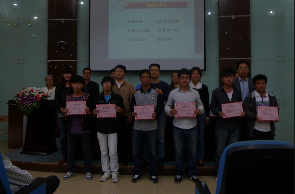 之后王芳老师、汪志达老师、陈光绒老师、刘利峰老师和胡国伟老师分别对本次运动会上表现优秀的运动员,及优秀班级进行表彰。其中包括电子系运动会“道德风尚奖”班级:网络3101、电子3101、电子3102、电子2112、计算机3115、通信3100。优秀运动员荣誉称号,优秀班导以及对在本次运动会上辛苦工作的体育部、志愿者部、信息部、生活部、办公室、学习部、素质拓展部、纪检部、宣传部、文娱部、外联部、组织部等学生会各部门优秀干事进行“优秀工作者”称号的荣誉表彰。
