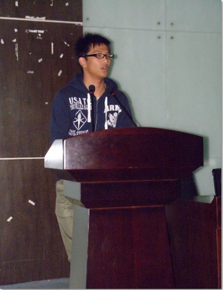 图为:文娱部干事沃江宁正在演讲