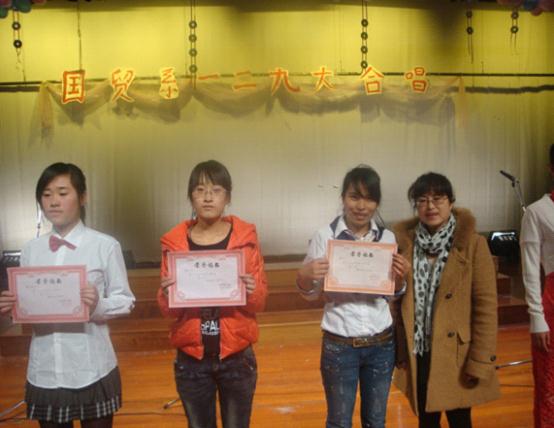十二月二日晚六时,国际商贸系在李惠利艺韵楼举行了2011年国际商贸系一二.九大合唱比赛。本次比赛以班级为单位组织合唱队,每班演唱两首歌曲,一首宁波职业技术学院校歌和一首自定曲目。共设一、二、三等奖各一名和一位最佳指挥。国际商贸系党总支副书记袁建萍老师、国际商贸系团委书记王萌萌老师、国际商贸系辅导员王伟、陈远红、叶琼老师出席了本次比赛。借此次大合唱,同学们不仅受到了经典爱国歌曲和校歌的熏陶,更重新认识了身为祖国新一代和宁职新希望的重大使命。