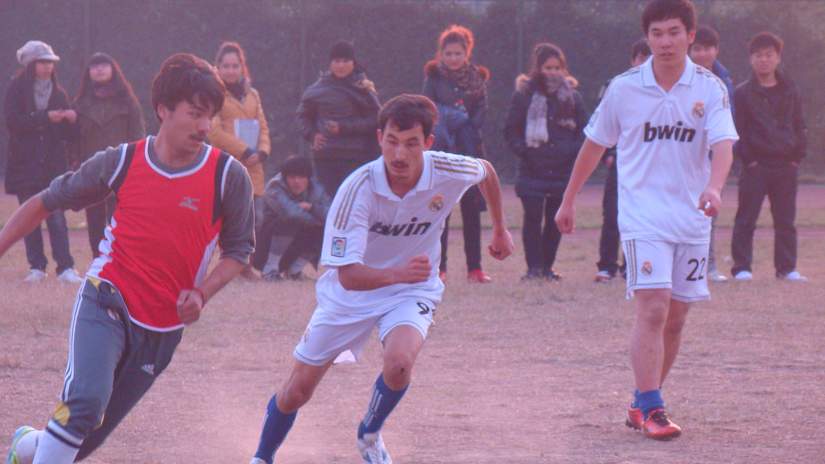 随着裁判员的一声哨响,比赛正式开始。身穿白色球衣的建筑系队员一开始便展开了猛烈的攻势,用细腻的脚法、精妙的配合,步步紧逼,始终将电子系压在其半场。而上半场中段,经过电子系队长的短暂部署,电子系的球员们也逐渐进入了状态,缜密的队形,很快比赛就进入了白热化阶段。精彩的断球,突破赢得了观众的连连掌声。上半场结束时,建筑系以1:0暂时领先。
