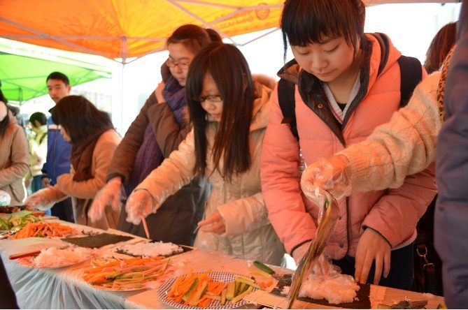 本着以“快乐为本,丰富生活”的宗旨,各协会开展了各式各样的活动,书法协会的书法大竞猜,数独竞赛的数独填字,摄影协会的“宁职瞬间”摄影大赛,会计协会的点钞大赛等等。像“猜字谜”、“韩服、日服展示”都备受同学们的喜爱,但最受欢迎的是美食协会开展的“寿司制作”,吸引了无数的同学前来制作和品尝。一排桌上放满了各类做寿司的材料,新鲜的黄瓜、鲜红的胡萝卜条都是十分的诱人,最重要的是香喷喷的白米饭吸引了好多的同学。很多同学们都是第一次做寿司,但个个都做得有模有样。先把竹炭子放在桌上,铺上一层紫菜卷,再把喷香的白米饭严严实实的铺满整个竹炭子,之后就是加上各式的料理。再一卷一切,美味的紫菜卷就产生了。同学们不仅自己品尝自己亲手做得紫菜卷,还把它分享给其他的同学们。而其他协会也精彩纷呈,韩语协会、日语协会韩服、日服试穿的活动前,也是挤满了人。不管男生女生都穿上异国的服装,展示不同的风情,也同样吸引了不少人前来观看。