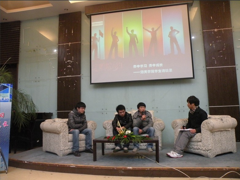 其中张进朝、寇凯岑、章潞杭三位嘉宾讲述了他们在参赛《全国职业院校机器人大赛》过程中的经验,他们是一个团队,为了这次比赛,休学半年。在这半年中,他们潜心研究机器人,每天从早上8点一直到晚上11点,互帮互助,互相坚持着,把团队精神发挥到极致。他们付出了常人难以想象的汗水和艰辛。他们一直坚信这样一句话:“付出不一定有回报,但是不付出是肯定没有回报的。”就是凭着这样的一份执着,走完了这半年。不见风雨怎见彩虹。结果,在大赛中获得了三等奖。他们表示这与付出不成正比,这是仍然是失败。失败并不重要,注重的是过程,在过程中学习,在过程中成长,真正的成功不会很远。