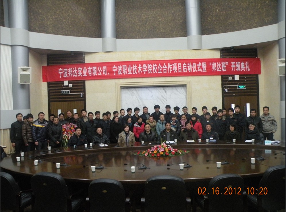 2012年2月16日上午9:30由海天学院主办的“宁波邦达实业有限公司、宁波职业技术学院校企合作项目启动仪式暨《邦达班》开班典礼”在宁职院东校区国际会议厅隆重举行。参与本次典礼的有校企领导、嘉宾及全体“邦达班”学员。