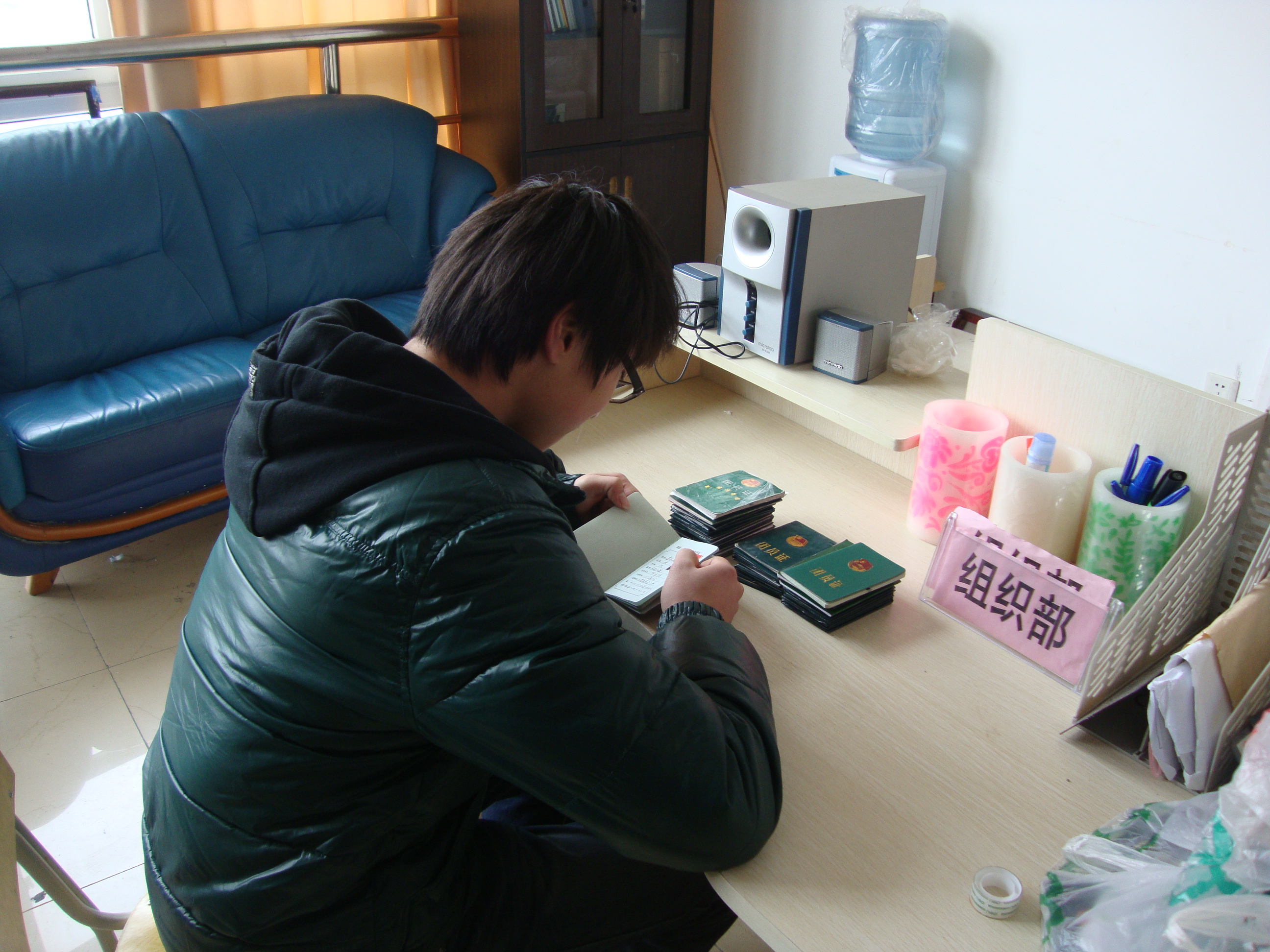 图为:学生干事正在服务站值班