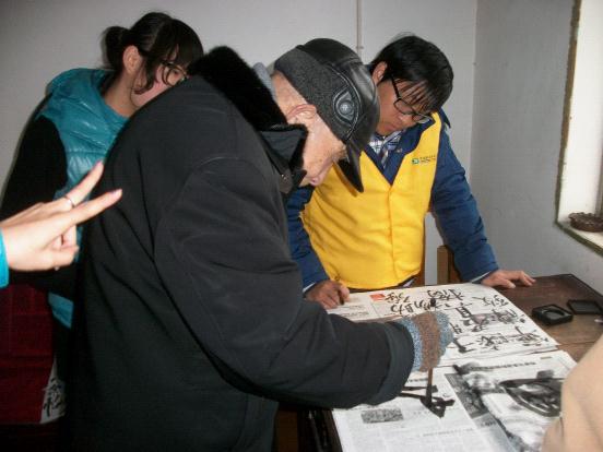 图为:志愿者在学习老人写书法