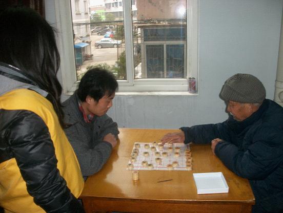 其中有一位老人,曾经是宁波市的象棋比赛的第一名。现在虽已壮年不在,但可谓宝刀未老,威武不减啊,直杀的我们毫无还手之力。??不惊的淡然态度。