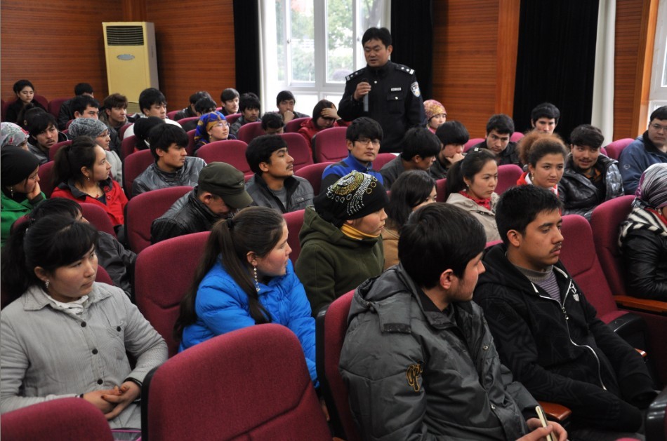 3月15日下午,我院学工部有幸邀请到大?派出所副所长张应立,在外语楼102为我院新疆班学生开展一场关于如何防止犯罪侵害的专题讲座。出席本次讲座的领导有北仑公安分局政治处王主任、常副主任、大?派出所辖区民警沈阳林,以及我院团委书记、学工部副部长励宁、学校保卫处处长应时伦。