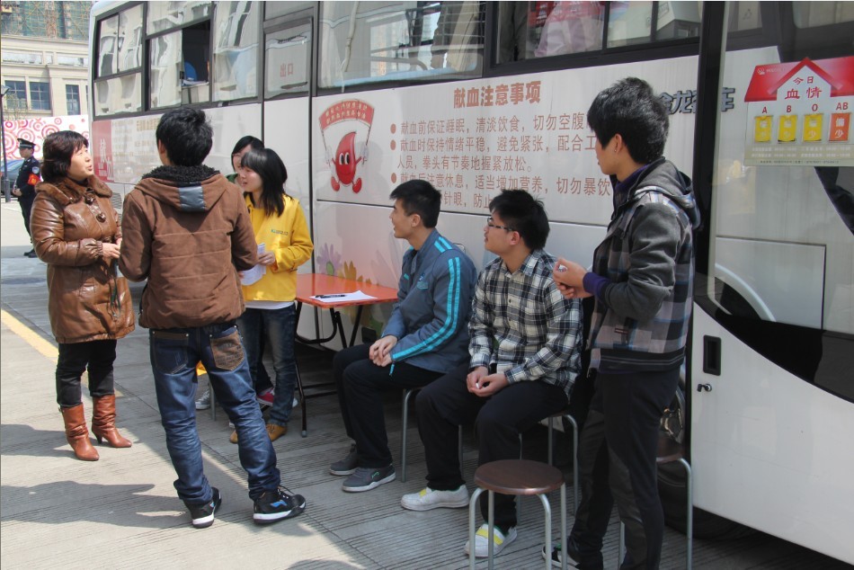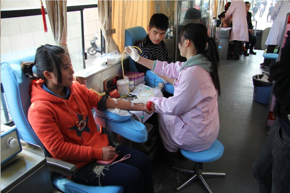 本次献血活动分为五个步骤:一是验证登记,同学们需要携带身份证并填写一份《健康情况征询表》和《献血登记表》;二是体格检查,医生对同学们进行一些必要的体格检查,比如如果同学没有达到90斤是不能参加献血的;三是初筛化验,体格检查合格后,取同学们1到2滴手指血进行血色素、血型、HBsAg、ALT等项目的检查,;四是采血,在以上检查全部合格后,同学们就可以献血了;五是休息及领取,在同学们献完血后,会得到一个《无偿献血证》。面对五个献血步骤,有过献血经历的大二学生,是坦然与从容,而对第一次献血的大一同学则是激动与兴奋。他们怀揣着浓浓的热情,井然有序地进行着献血的每个步骤,整个过程没有紧张,有的是大家相互间的关心与鼓励。