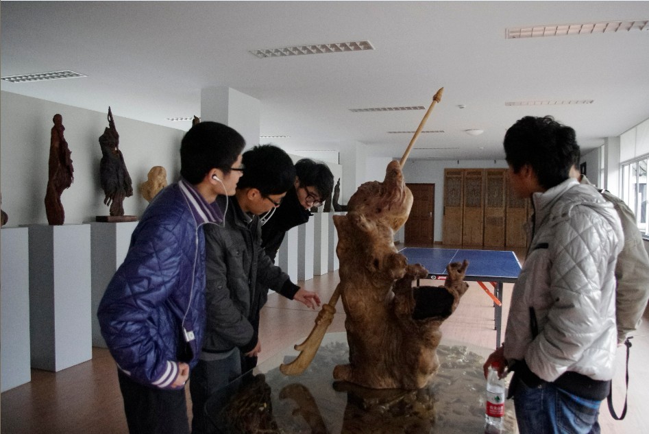 根雕,是以树根(包括树身、树瘤、竹根等)的自生形态及畸变形态为艺术创作对象,通过构思立意、艺术加工及工艺处理,创作出人物、动物、器物等艺术形象作品。此次根雕小分队前去的是象山张德和根艺美术馆。据悉,早在11年暑期,我院根雕协会会员便来此地实践学习近一个月。