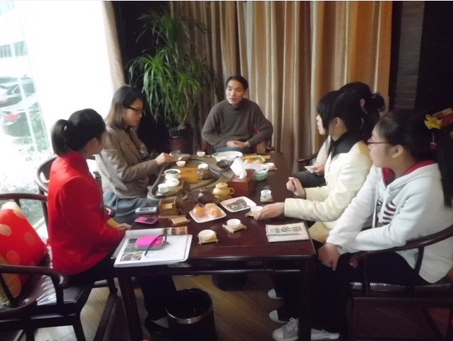 与此同时,茶艺协会的同学们与茶馆工作人员们一边品茶,一边交流茶艺文化。茶馆老板友善地向同学们分享了如何泡好茶的经验。而在细心讲述了他对茶文化的了解后,他还表示:茶馆要发展,茶艺工作者必须要有文化内涵,即对茶文化要有深刻的认识,从而能够从容地向品茶者介绍茶文化和弘扬茶艺的精髓。除此之外,茶馆馆长也向同学们讲解了茶道的礼仪和注意事项,她说,茶道不仅是一种以茶为媒的生活礼仪,也是一种修身养性的方式。作为一名茶艺工作者,最重要的是自身对茶艺的热爱与尊重。