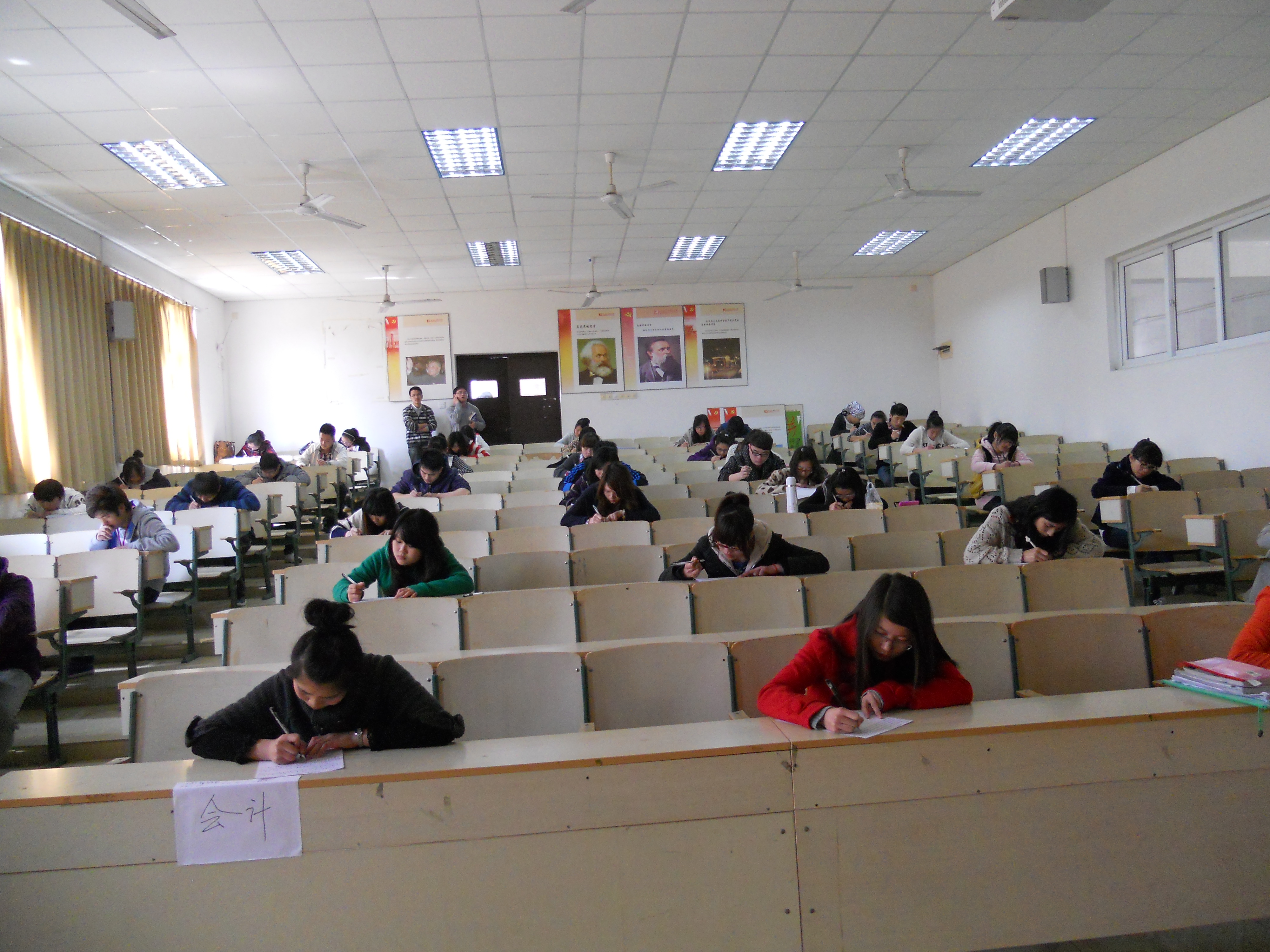 中午十二点十分整,部长助理竞选笔试正式开始,首先,虞凤翔学姐向同学们说明了此次工商管理系部长助理竞选的目的,是为了使得工商管理系更好地明天发掘人才,寻找一批能够管理部门的干事。接着,学姐要求我们按照正规的考试座位进行一个小时的笔试,即两个人之间有两个座位的间距,前后空一排。随即,大家调整位置开始等待试题的下发。