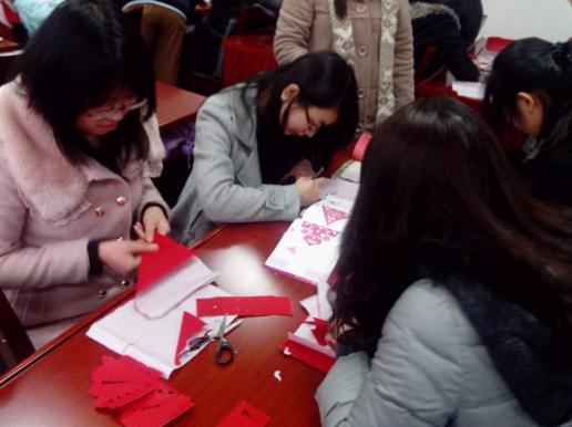 3月15日,为了迎接从外过来的客人,作为学习外语的我们成为了东道主。为此,我们特意开设了这个援外班,为了丰富他们在我们这边的旅游经历,我们特地安排了像今天一样的培训课。今天我们的上课内容是剪纸。为此我们邀请了剪纸协会的成员们,以及协会的指导老师乐奶奶。乐奶奶和协会成员们都做了精心的准备,为我们准备了纸和剪刀以及相关内容的书。这堂课,弥漫着一种期待而又兴奋的氛围,在这种氛围的驱动下,在奶奶和剪艺成员的指导下,剪纸的主题课顺利开展。呈现在大家面前的,是带有各式各样,具有中国元素的剪纸,我们也深刻的体会带来中国深厚的文化底蕴。
