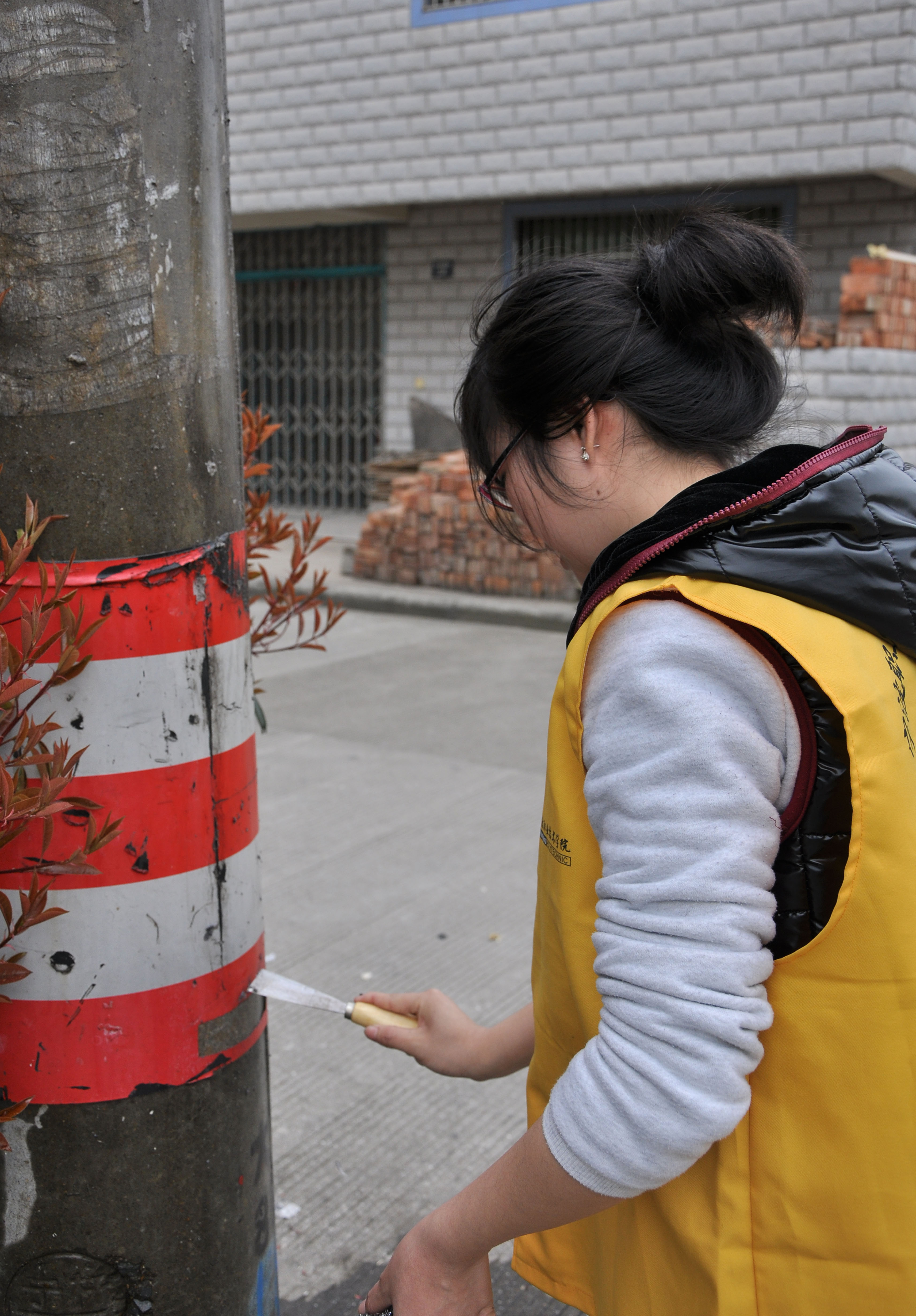 图为:党校学员清除电线杆上的牛皮癣