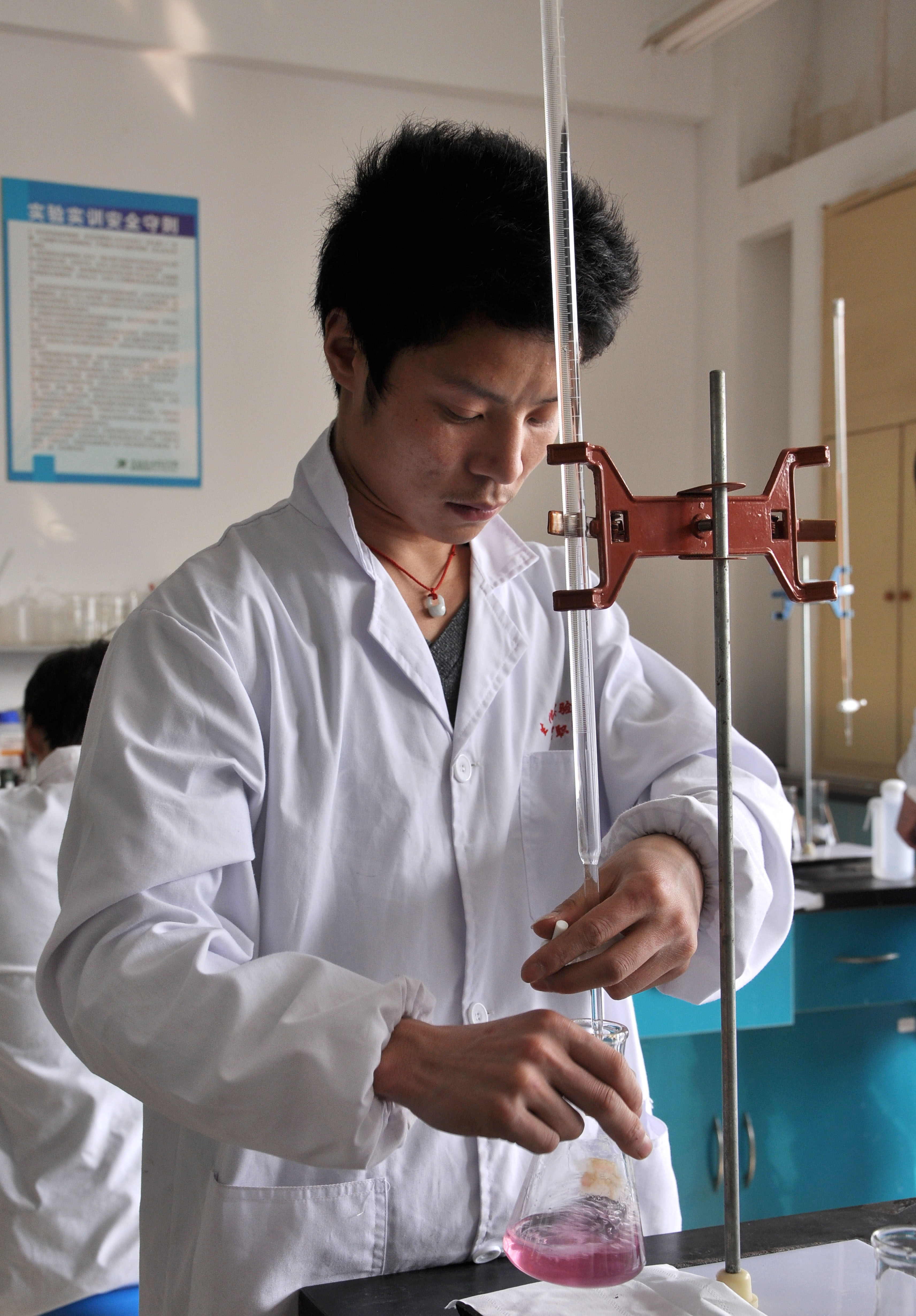 中午1点参赛选手们按时到达技能竞赛室,本次技能训练验收在美好的春光里拉开了帷幕。参赛选手们像平时一样,熟练地按照实验步骤开始操作。老师们也专心地看着选手们的操作并拿着纸和笔记录选手们在操作过程中出现的错误,以便在以后的训练中吸取教训,更好地提高选手们以后操作的规范性。在一次滴定操作中一位参赛选手由于指示剂添加的过少,导致滴定终点变色不明显,老师们纷纷帮着找其中的原因。滴定操作中终点时所添加量的多少的控制是决定实验误差的关键,而实验误差的大小是技能竞赛的考核的重要评判因素。在这次技能训练验收过程中老师们以自己的经验帮助同学怎样更加准确地判断滴定终点的到达、怎样确定一滴和半滴的操作方法以及在称量过程估算还需添加所称样品的量,经过4个小时的实验操作,准确滴定标定和实验数据的处理。本次技能训练验收于5点圆满结束。