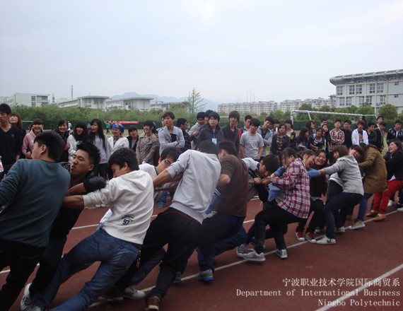 2012年4月12日下午1点国际商贸系队员与我院其他6个系的同学在操场上进行了拔赛。此次活动旨在培养同学们团结协作、拼搏进取的集体主义精神。比赛以系别为单位,采取男女混合、三局两胜制方式进行比赛。