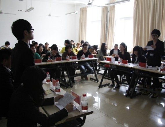 在112教室进行辩论的对阵双方是国际商贸系和建筑工程系,担任比赛裁判的是人文社科部的刘光艳老师、人文社科部的杨静老师、校学生会主席沈佳燕学姐和校学生会办公室主任兼资深辩手金丹学姐。国际商贸系持文化建设应先于经济发展的观点而建筑工程系持经济发展应先于文化建设的观点。来自国际商贸系的代表队及来自建筑工程系的代表队唇枪舌战,碰撞出思想与智慧的火花。此次比赛程序共由开场陈词、攻辩、攻辩小结、自由辩论、观众提问、总结陈词六部分组成。首先是由正反方一辩进行开篇立论,他们用最精炼的语言阐明本方基本立场、逻辑框架、理论依据、事实材料等,接下来是针锋相对的攻辩和精彩纷呈的自由辩论环节,双方辩手互不相让,将水平发挥到极致,再接着是由四辩进行总结陈词,滴水不漏的陈词让现场掀起了一阵高潮,最后是观众提问阶段,这个阶段不仅调动了观众的积极性,还也增强了辩手与观众现场的互动。