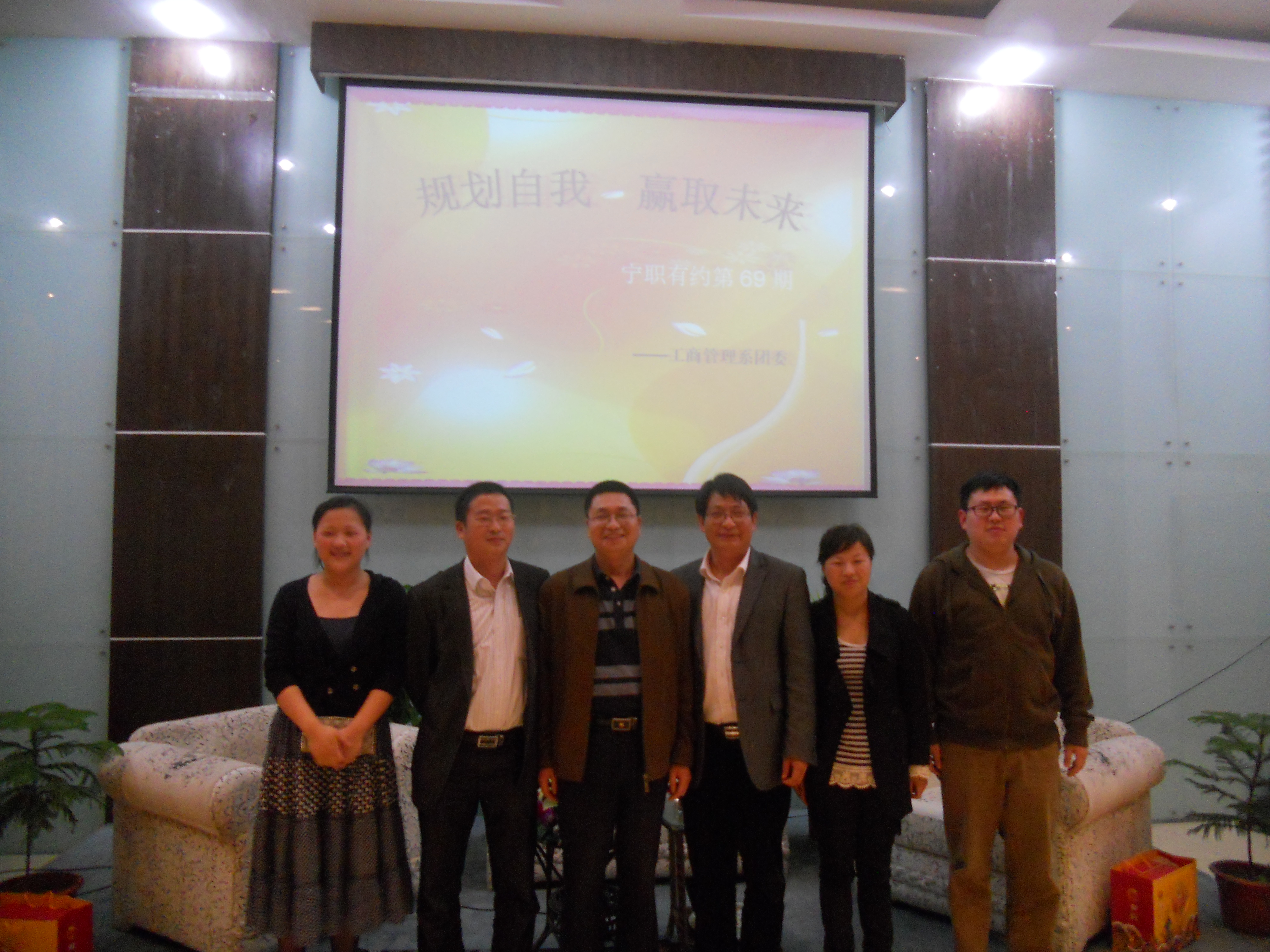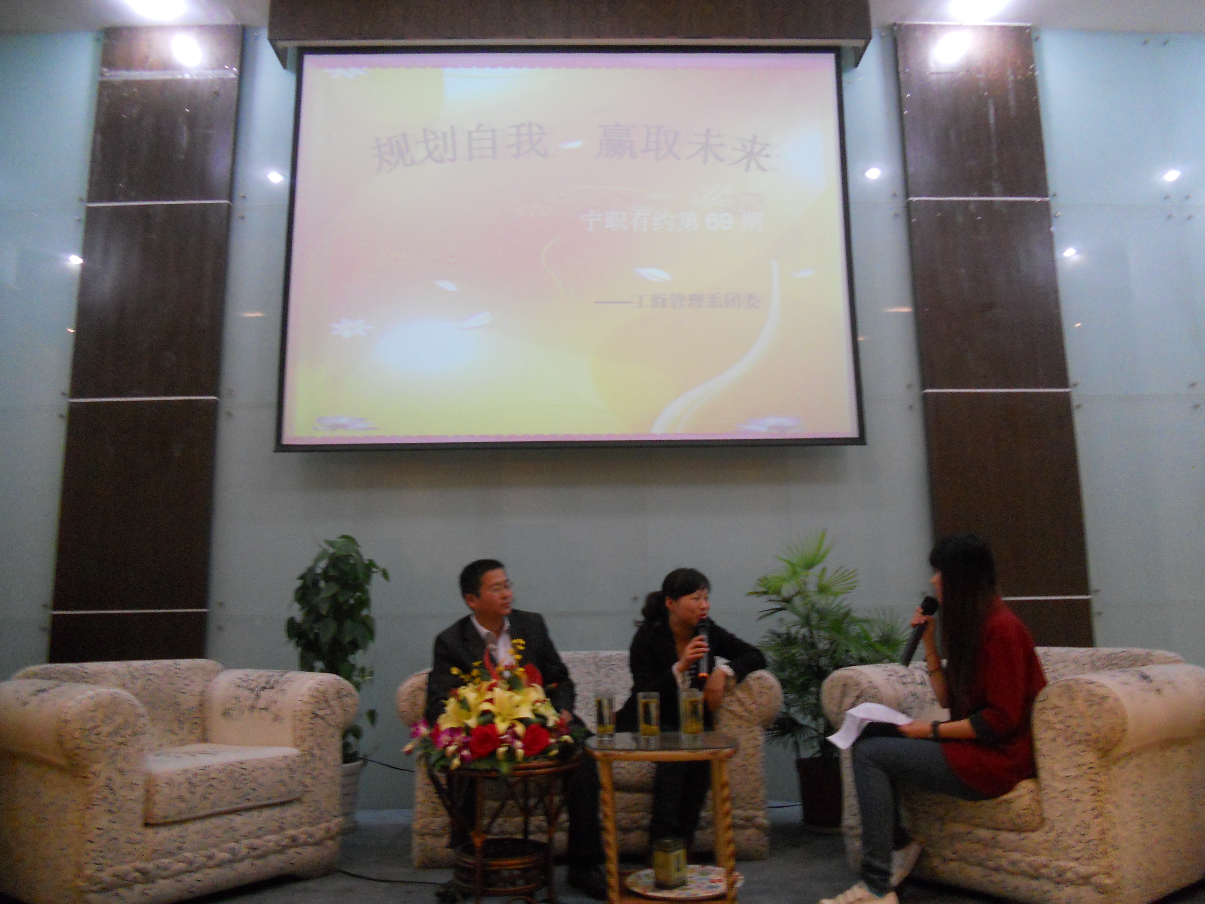 为了更好的使同学们能够对自己有一个明确的人生规划,赢取未来,一起畅听往届学姐学长的成长奋斗故事,工商管理系于4月19日晚上6点30分,在明德楼105教室,举办了第69期《宁职有约》栏目,对柴红兵、应科儿两位资深校友进行访谈,与同学们一起分享自己学习和工作的成功心得。活动邀请到了学工部部长郭华恬老师、工商管理系党总支书记裘腰军老师、工商管理系党总支副书记沃意琳老师、院团委副书记赖敏雅老师、系团委书记陈洁琼老师,团委辅导员赵琦老师、李婷?老师以及会计班的同学。