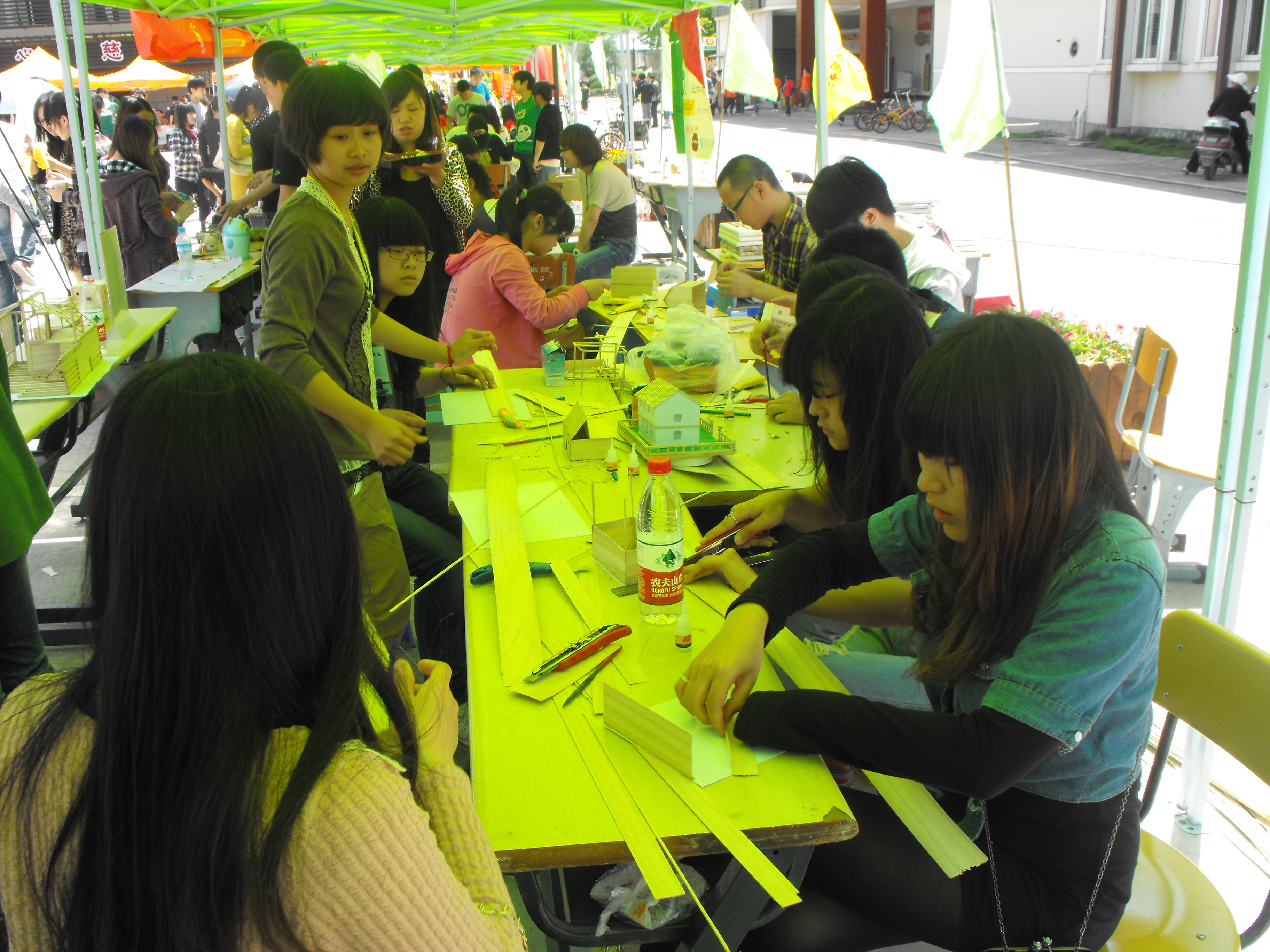 在展区后台,我们可以看到许多对模型制作感兴趣的同学在现场制作模型。在模型制作上有着丰富经验的主办同学则在一边不断提醒着注意事项。到关键时刻更是亲自操刀上阵,手把手地教同学们制作。只见一张张木板和一根根木棍在同学们的手中变成了魔术般地变成了一个个建筑模型。许多同学在模型制作台前一坐就是几小时。一整天的活动中,同学们不仅获得了自己亲手制作的模型,更是在制作过程中学到了许多建筑和模型制作方面的知识。